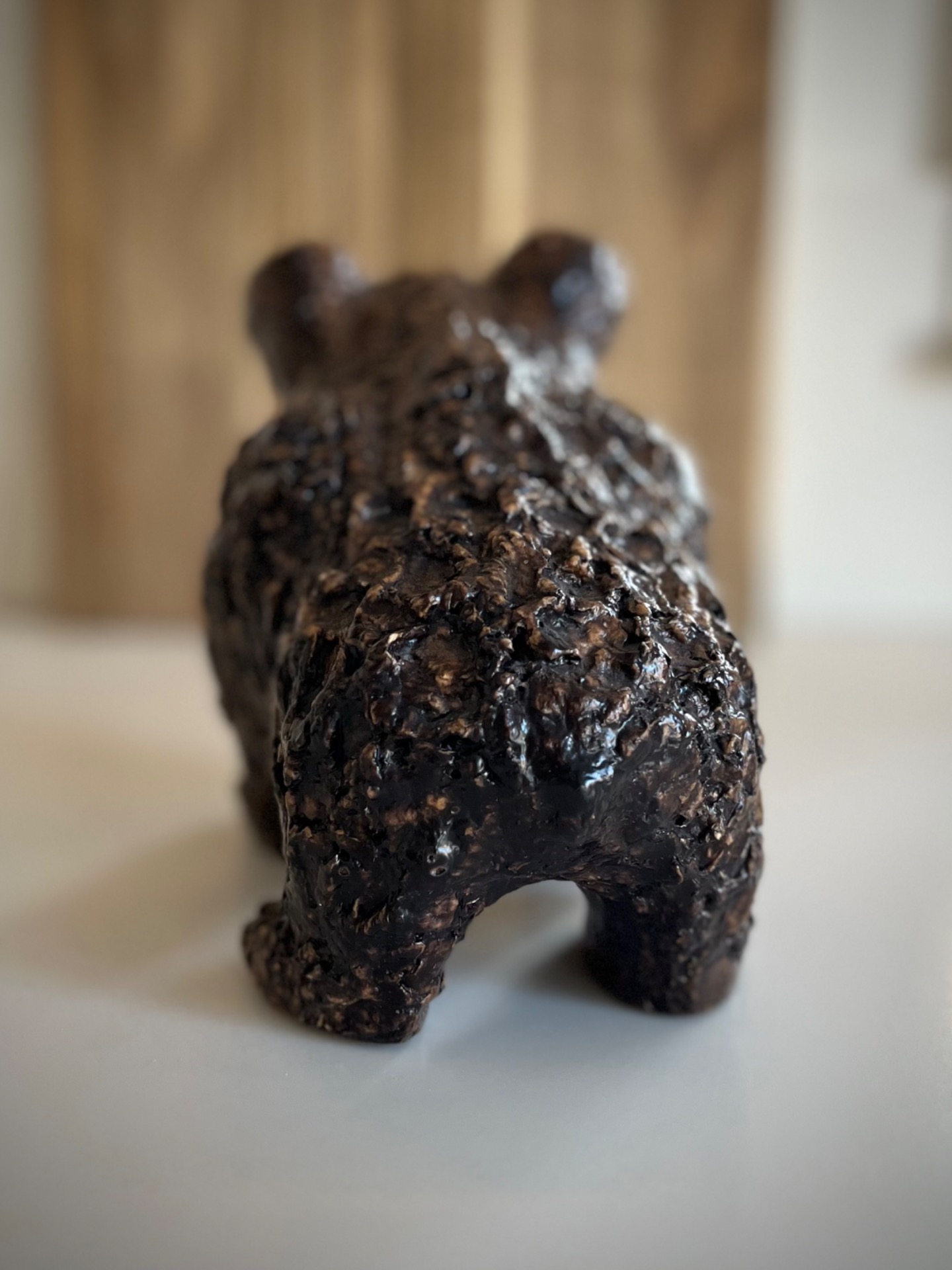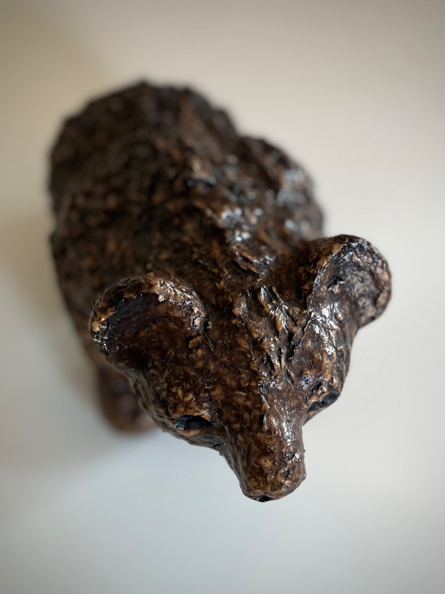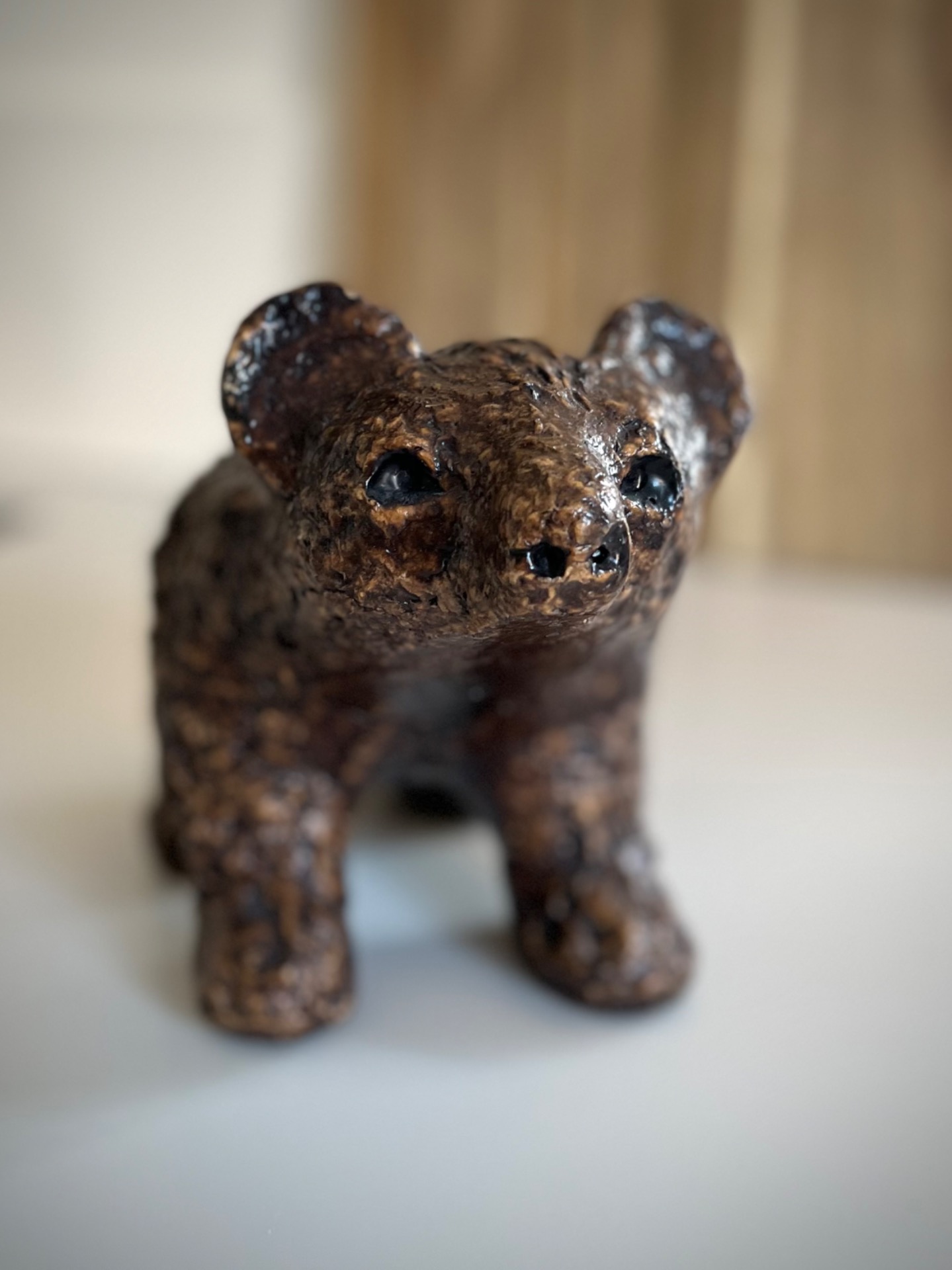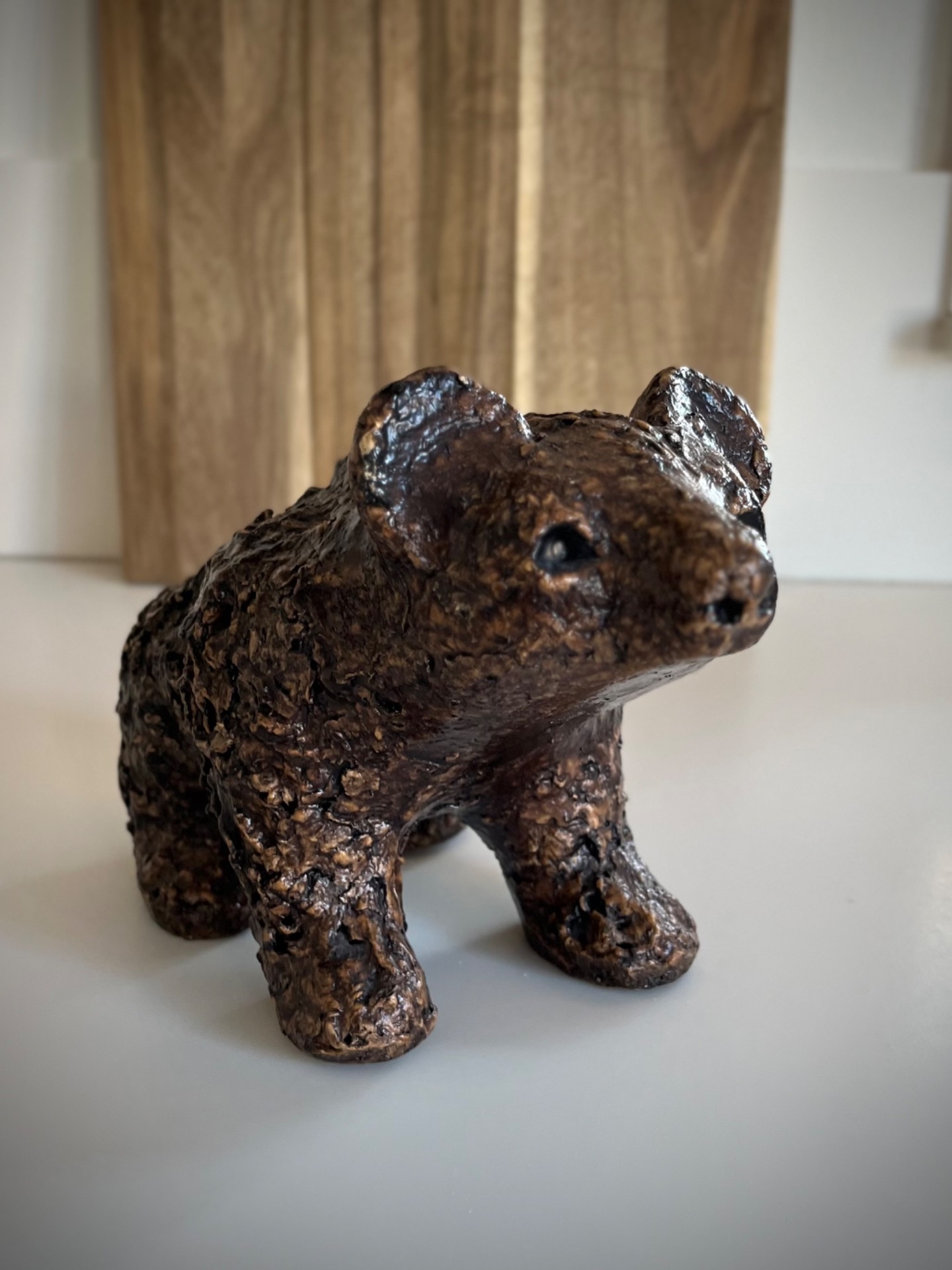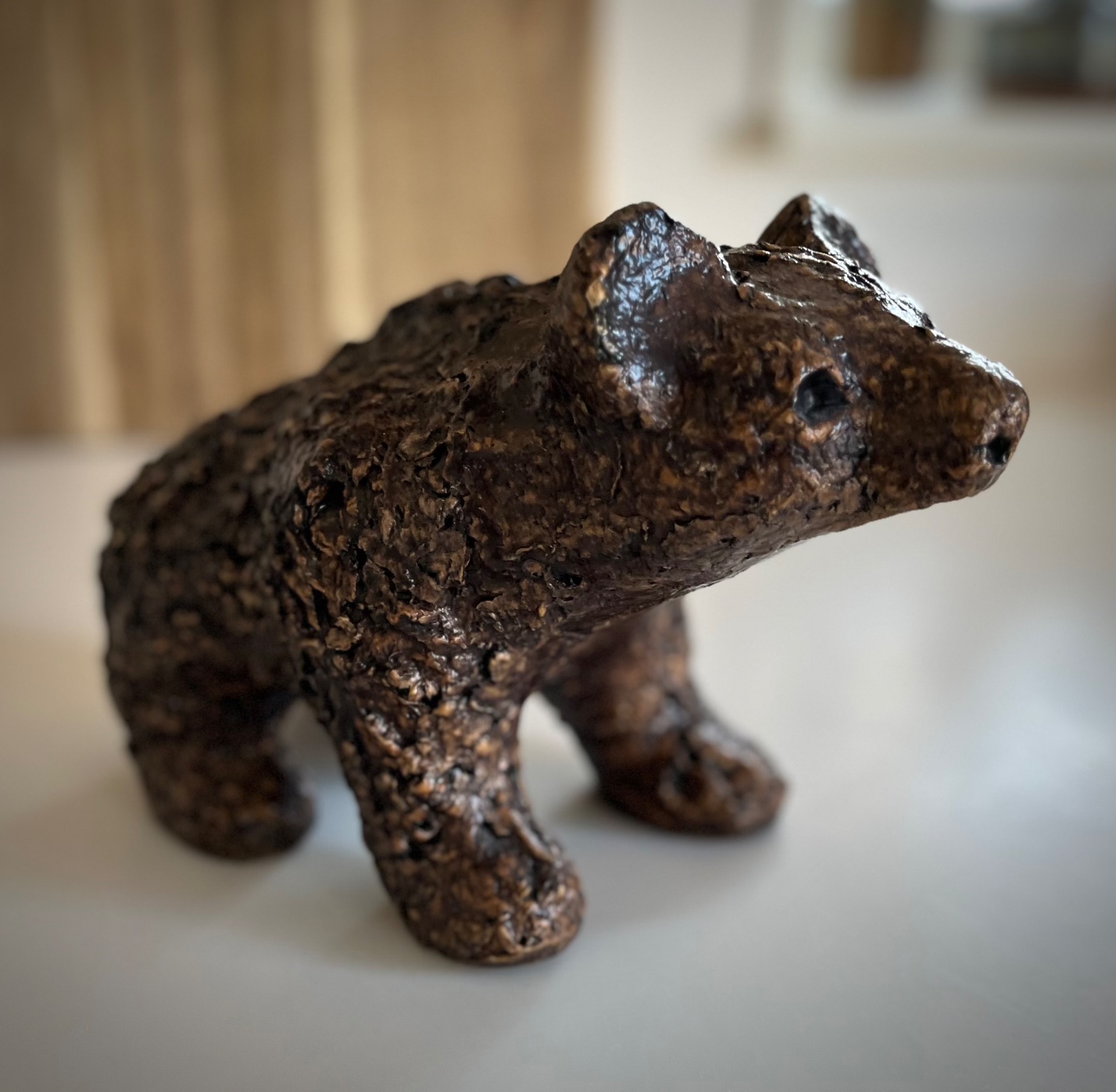 Figurin av en brunbjörn, gjord av träspån och lim från 50/60-talet.