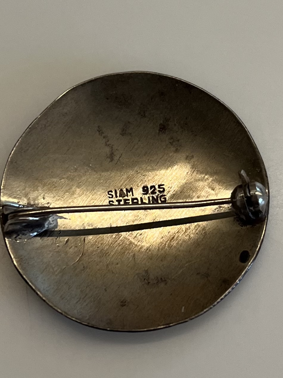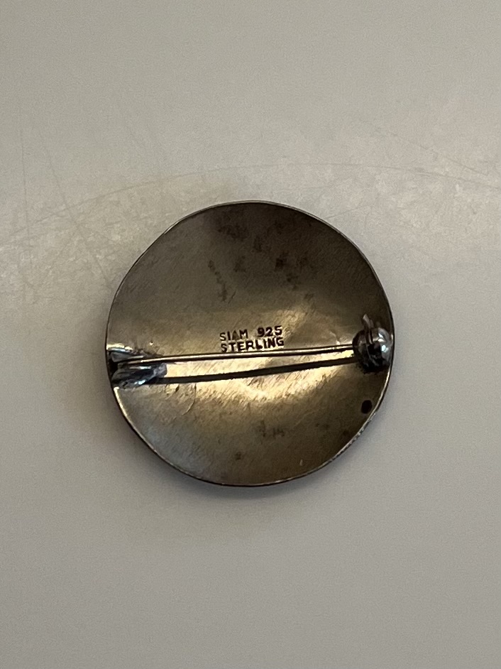 Smycket är gjort av sterlingsilver med en teknik som kallas niello, där svarta metallföreningar läggs i etsade mönster.